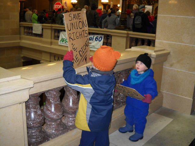 Before the prank call, there was already speculation and concern about Walker's political ties to the Koch brothers. David and Charles Koch, who are based in Wichita, KS, are extremely wealthy - multi-billionaires - and their money comes from the oil industry, power plants and manufacturing. They are also extremely conservative politically and have made it their business to weaken government and regulations as much as they possibly can by pouring money into getting people elected who can best serve their interests. This is done in all kinds of ways, from donating to political candidates directly (they gave $43,000 to Walker when he ran for governor last fall), donating to organizations that support those candidates (they gave one $1 million to the Republican Governors' Association last fall, and the RGA in turn spent $5 million on attack ads against the Democratic candidate Tom Barrett in one of the most expensive gubernatorial races in history), and they fund think tanks with benign-sounding names like Citizens for Change to influence the public. Rumor has it the Koch brothers paid for the buses full of Tea Party activists to show up last weekend. (For more on the Koch brothers and their opposition to the Democratic party, especially President Obama, see this piece from last August in the New Yorker. It's rather long, but excellent.)